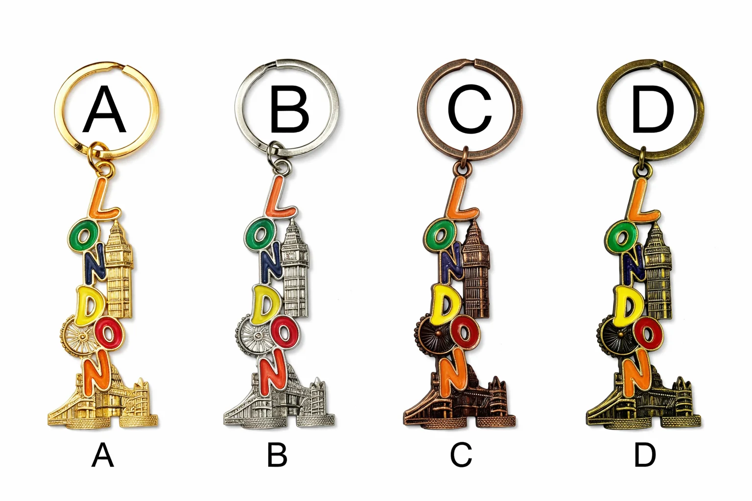 This London Landmark Letters Metal Keyring features a vibrant vertical “LONDON” design with colourful enamel lettering, combined with detailed London icons including Big Ben, the London Eye, and Tower Bridge. Crafted from solid metal with raised detailing, it offers a bold and eye-catching London souvenir that is durable and stylish—perfect for everyday use, gifting, or souvenir retail displays. Available in a variety of metallic finishes.