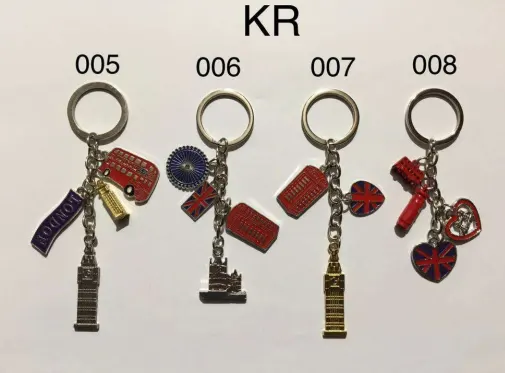 This London Multi-Charm Icon Keyring Collection features a fun assortment of classic London symbols, including Big Ben, red telephone boxes, double-decker buses, Union Jack hearts, and London Eye details. Each keyring showcases multiple dangling metal charms with colourful enamel finishes, creating a lively and collectible London souvenir design.