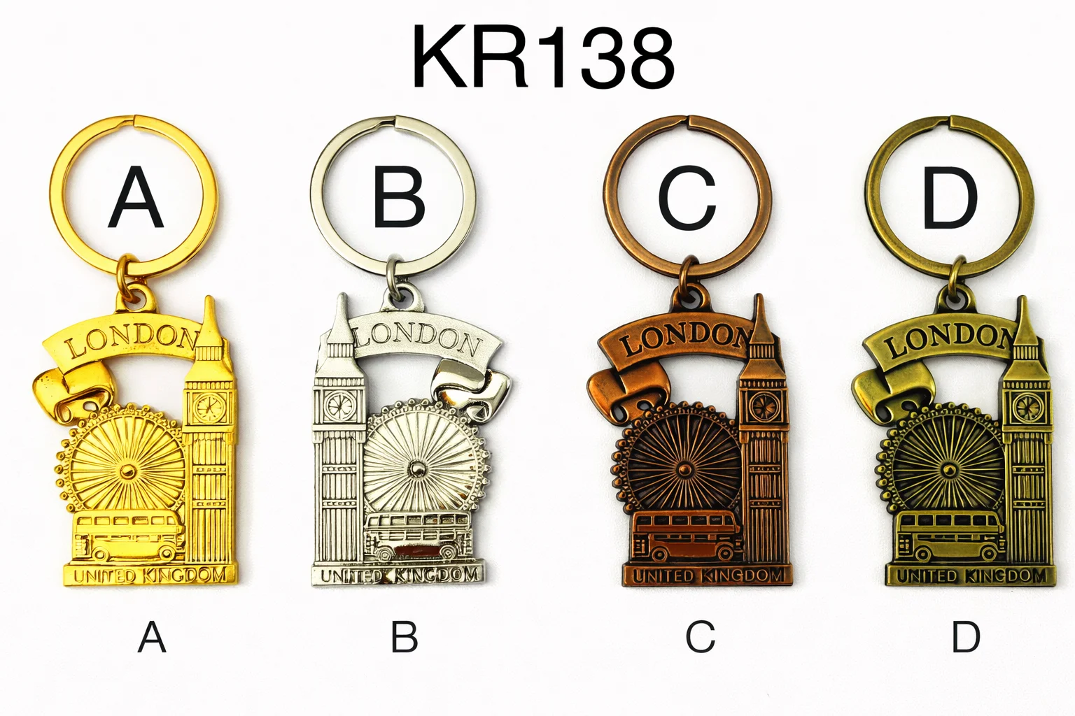 This London Big Ben & London Eye Metal Keyring features a detailed embossed design showcasing two of London’s most iconic landmarks – Big Ben and the London Eye – along with a classic London bus and scroll-style “London” banner. Finished with “United Kingdom” text at the base, this solid metal keyring offers a timeless and elegant London souvenir look, perfect for everyday use, gifting, or souvenir retail displays. Available in multiple metallic finishes.