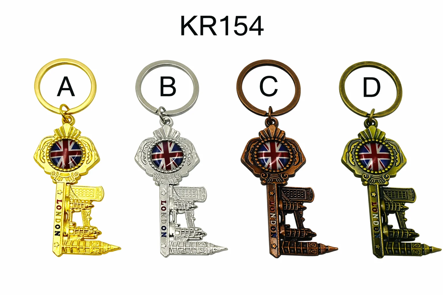 This London City Icons Charm Keyring features an ornate vintage-style key design with detailed London landmark engravings and a central Union Jack emblem. Made from solid metal, it combines classic British symbolism with an elegant souvenir look. Available in multiple metallic finishes, it is a distinctive and durable accessory, ideal for gifts or London souvenir collections.