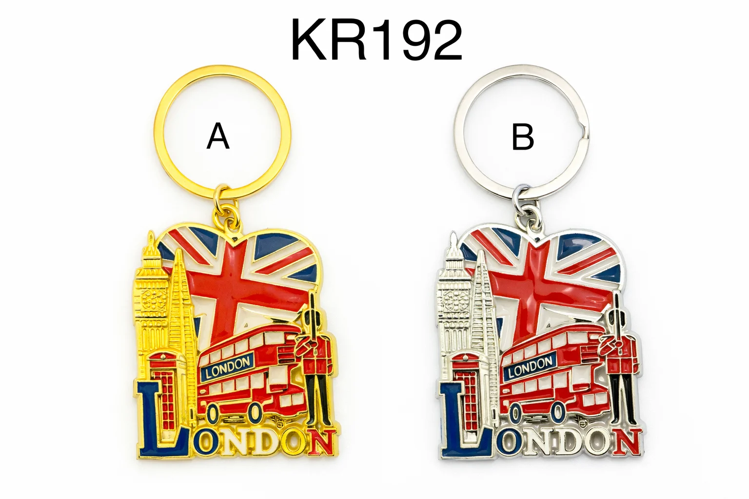 The London Landmark Souvenir Keyring features vibrant colors and iconic London symbols, including Big Ben, the London Eye, a red double-decker bus, and a British guard, all framed by a heart-shaped design with the Union Jack flag.