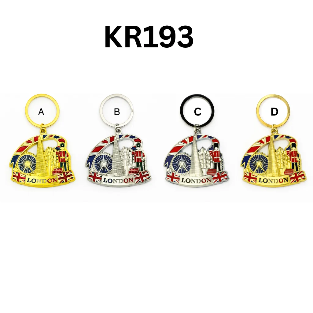 The London Tourist Souvenir Keyring showcases iconic London landmarks, including the London Eye and Big Ben, framed by the Union Jack flag and a British Guard. The keyring is available in multiple finishes, making it a vibrant and collectible souvenir.