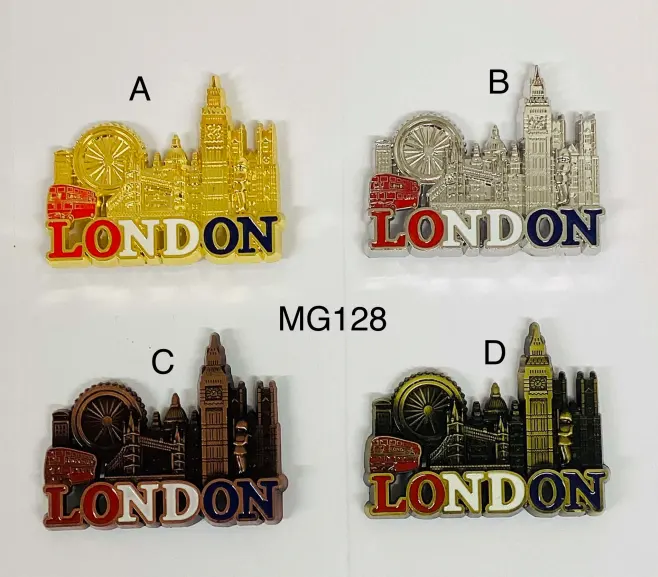 This London Skyline Souvenir Magnet showcases a detailed cityscape featuring iconic landmarks including Big Ben, the London Eye, Tower Bridge, and a classic red double-decker bus, finished with bold “LONDON” lettering. Crafted from solid metal with rich enamel detailing, it captures the spirit of the capital in a compact and eye-catching fridge magnet. Available in multiple metallic finishes.