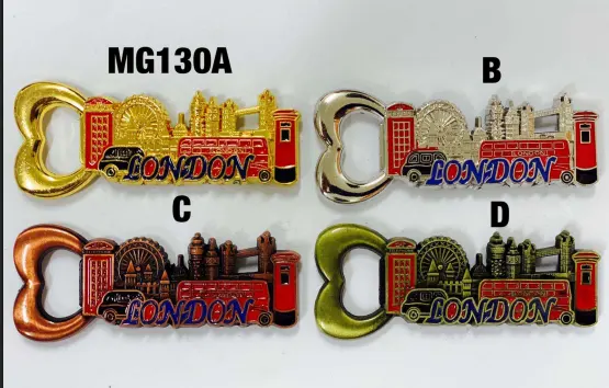 This London Skyline Bottle Opener Magnet features a detailed panoramic design showcasing iconic London landmarks including the London Eye, Big Ben, Tower Bridge, a red double-decker bus, and a classic telephone box, finished with bold “LONDON” lettering. Crafted from solid metal with vibrant enamel detailing, it combines a practical bottle opener with a strong fridge magnet, making it a functional and eye-catching London souvenir. Available in multiple metallic finishes.