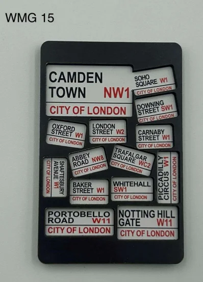 This Camden Town Street Signs Wooden Magnet features a bold and modern collage of iconic London street names and districts. Showcasing famous locations such as Camden Town, Oxford Street, Baker Street, Abbey Road, Carnaby Street, Piccadilly Circus, Soho Square, and Notting Hill Gate, this design captures the character of London through its instantly recognisable street signage style. Crafted from wood with high-quality printed detailing and a strong magnetic backing, it’s a stylish and contemporary London souvenir.