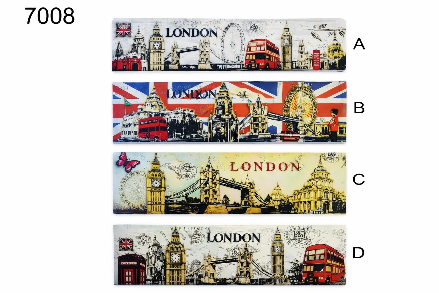 The Welcome to London Panoramic Long Fridge Magnet showcases a detailed horizontal skyline featuring iconic London landmarks such as Big Ben, Tower Bridge, the London Eye, red double-decker buses, telephone boxes, and Union Jack elements. Each design combines classic illustration with vibrant colours, making it a perfect London souvenir or decorative magnet for fridges and magnetic boards.