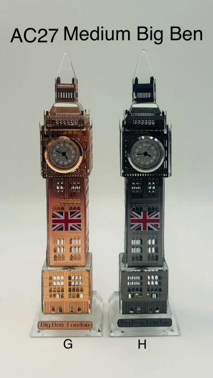 This Medium Big Ben Crystal Clock showcases a finely detailed replica of London’s iconic Big Ben tower, complete with a built-in clock face and Union Jack detailing. Finished in elegant antique-style tones, it offers a classic London souvenir look and works perfectly as a decorative clock for desks, shelves, or gift displays.