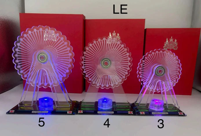 This London Eye LED Crystal Display features a clear crystal-style London Eye design with an integrated LED light base that creates a vibrant illuminated effect. With detailed craftsmanship and a polished finish, it offers a modern London souvenir look and makes a striking display piece for shelves, counters, or gift collections. Available in multiple size options.