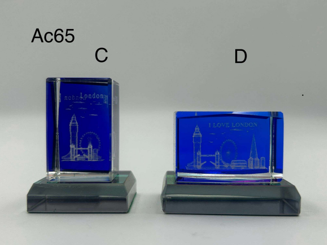 A compact crystal-style glass block featuring finely laser-etched London skyline designs. Available in two styles: classic London skyline and I Love London motif. Perfect as a small desk ornament, gift add-on, or souvenir display piece.