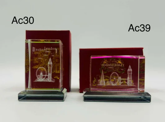 This London Skyline Crystal Display Block features a clear crystal-style block with elegant gold-toned laser-engraved London landmarks, including Big Ben and the London Eye. Set on a solid base, it offers a premium London souvenir look and works beautifully as a display piece for desks, shelves, or gift collections. Available in vertical and horizontal designs.