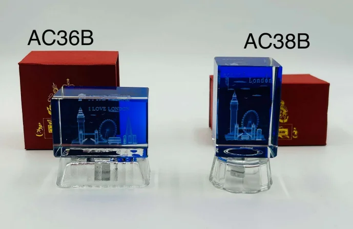 This London Skyline Crystal Display Cube features a deep blue crystal-style cube with finely engraved London landmarks, including Big Ben and the London Eye. Set on a clear matching base, it offers a sleek and modern London souvenir look and works perfectly as a stylish display piece for desks, shelves, or gift collections. Available in two cube styles.