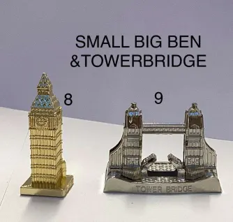 This Small Big Ben and Tower Bridge Metal Display features two iconic London landmarks in compact metal designs. With fine architectural detailing and a solid feel, these miniature displays offer a classic London souvenir look and are perfect for desks, shelves, or small gift items. Ideal as a matching landmark set or individual display pieces.