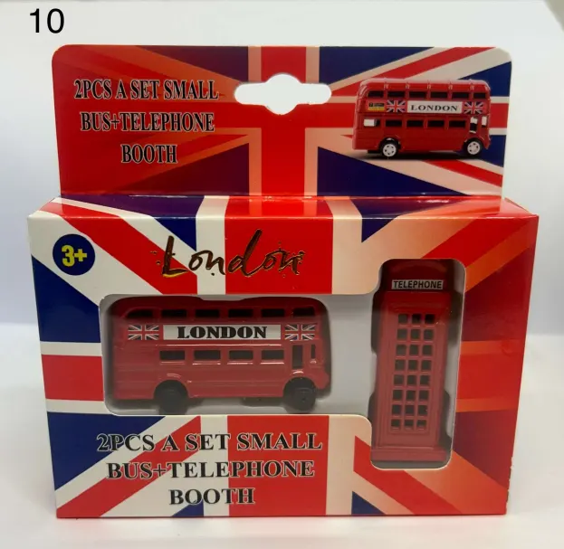 This Small London Bus and Telephone Toy Set features two classic British icons: a miniature red double-decker London bus and a traditional red telephone box. Designed for simple play and display, this compact set offers a fun and colourful London souvenir look. Supplied in a Union Jack themed presentation box, it is ideal for gifting, children, or souvenir shop displays.
