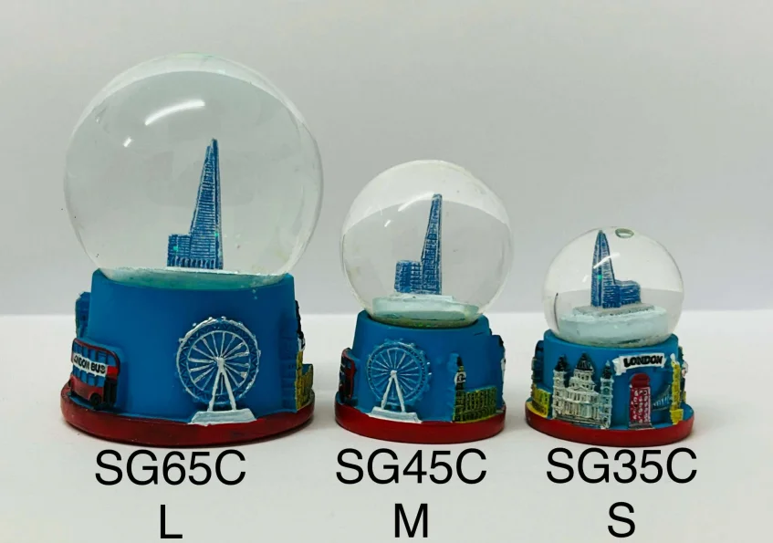 This London Shard Snow Globe features a detailed miniature of The Shard inside a clear globe, set on a decorative base highlighting iconic London landmarks such as the London Eye, classic buildings, and a red telephone box. Gently shake to enjoy the snowfall effect, making it a stylish and modern London souvenir, perfect for display or gifting. Available in three size options.