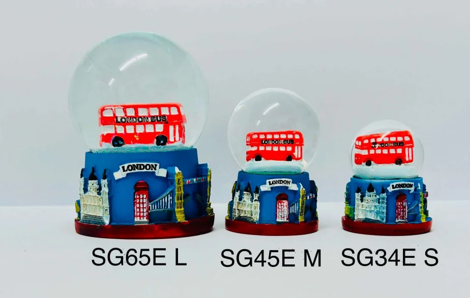 This London Red Bus Snow Globe features a classic red double-decker bus displayed inside a clear globe, set on a decorative base with iconic London landmarks and city architecture. Shake gently to enjoy the snowfall effect, making it a charming London souvenir and an eye-catching display piece for shelves, desks, or gift collections. Available in three size options.