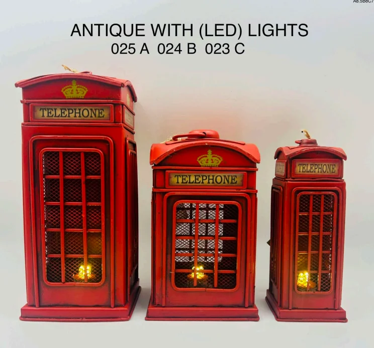 This Antique Style London Telephone Box features a classic British red design with a vintage-effect finish and built-in LED lighting. When switched on, the warm LED glow shines through the window panels, creating a cosy and eye-catching display. Finely detailed with crown and “TELEPHONE” signage, this piece is ideal for shelves, counters, gift displays, or London-themed collections. Available in three sizes to suit different display needs.