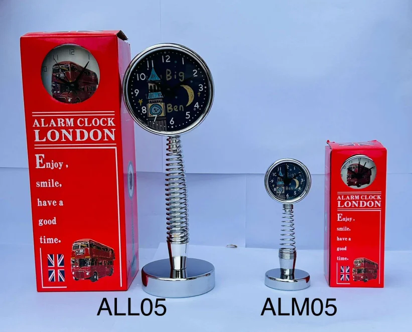 This London Spring Stand Alarm Clock features a round clock face mounted on a flexible chrome-finish spring stand with a solid metal base. Designed with iconic London imagery such as Big Ben and classic London buses, it adds a fun and modern touch to desks, bedside tables, or shelves. The spring stand gives a gentle bounce effect while maintaining stability, making it both decorative and practical as a daily alarm clock. Supplied in attractive London-themed packaging, ideal for gifting.