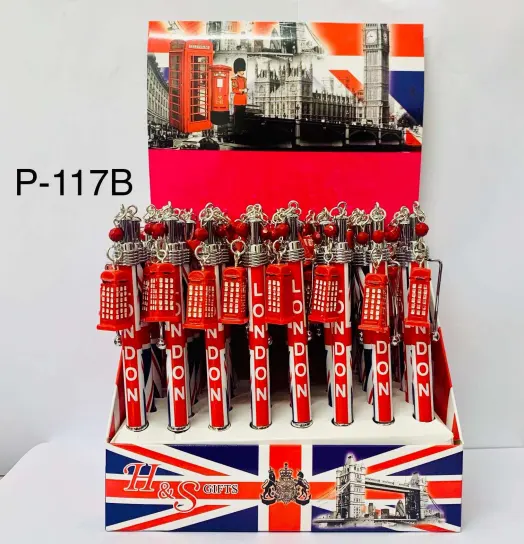 This vibrant London souvenir pen display features red pens topped with classic red telephone box keyring charms. Each pen is printed with bold “London” lettering and finished with metallic detailing and bead accents, capturing the iconic British style. Presented in an attractive Union Jack–themed countertop display with London landmark imagery, this set is ideal for souvenir shops, gift stores, and tourist outlets.