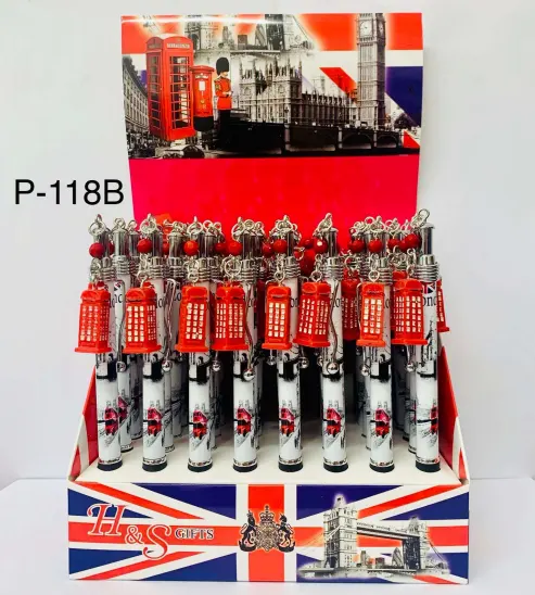 This eye-catching London souvenir pen display features white pens printed with classic London street and landmark artwork. Each pen is topped with a bright red British telephone box metal keyring charm, finished with a red bead for added detail. The set is presented in a Union Jack–themed countertop display box with iconic London imagery, making it an ideal high-impact item for tourist shops, gift stores, and souvenir outlets.