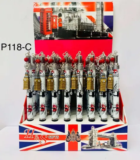 This striking London souvenir pen display features white pens decorated with classic London landmark artwork. Each pen is topped with a detailed gold-finish Big Ben metal keyring charm, accented with a red bead for a premium look. Presented in a bold Union Jack–themed countertop display with iconic London imagery, this set is ideal for tourist attractions, gift shops, and souvenir retailers looking for a high-appeal London-themed product.