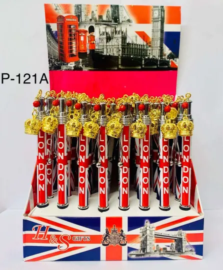 This elegant London souvenir pen display features red pens printed with bold LONDON text, each topped with a shiny gold crown–style metal keyring charm and finished with a red bead detail. Presented in a Union Jack–themed countertop display with iconic London imagery, this set combines classic British royal symbolism with everyday practicality. Ideal for gift shops, tourist stores, and souvenir retailers.