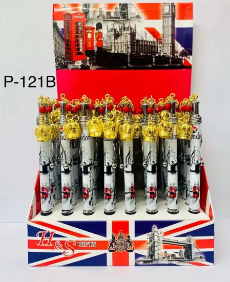 This premium London souvenir pen display features stylish black-and-white illustrated pens showcasing iconic London landmarks, finished with a striking red guard motif near the base. Each pen is topped with a detailed gold crown metal keyring charm and red bead accent, adding a regal British touch. Presented in a Union Jack–themed countertop display with classic London imagery, this set is ideal for tourist shops, gift stores, and souvenir retailers seeking a refined London-themed product.