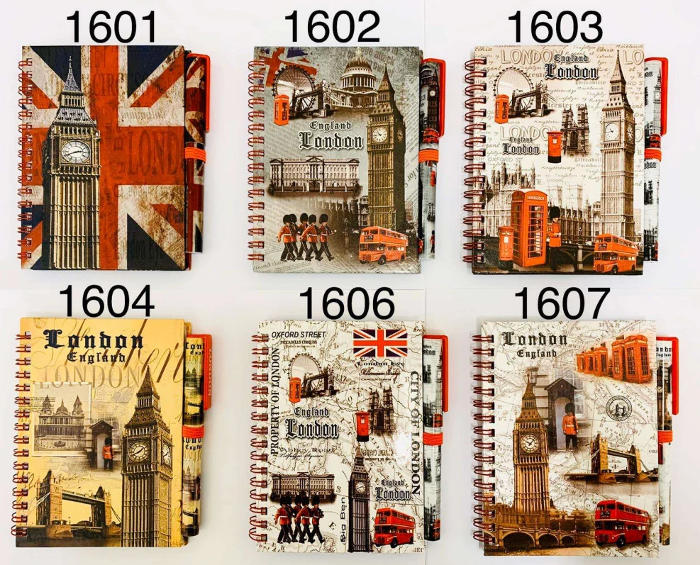 This stylish London-themed spiral notebook features vintage-style illustrations inspired by iconic London landmarks such as Big Ben, Tower Bridge, red telephone boxes, London buses, and royal guards. Each notebook comes with a matching pen secured in a side holder, making it a practical and attractive London souvenir. Ideal for journaling, notes, school, or gifting.
