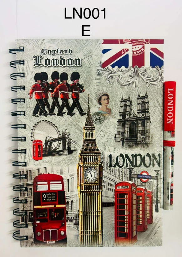 This London Collage Spiral Notebook with Pen features a detailed vintage-style collage of iconic London imagery, including Big Ben, red telephone boxes, a double-decker bus, and the Queen’s Guard. Finished with a sturdy spiral binding and supplied with a matching pen, it is ideal for note-taking, journaling, or as a practical London souvenir.
