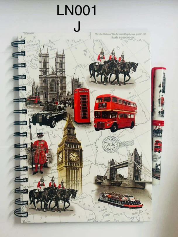 This London Heritage Collage Spiral Notebook with Pen features a vintage-style map background combined with iconic London imagery, including Big Ben, Tower Bridge, red telephone boxes, a double-decker bus, royal guards, and classic London scenes. Finished with a sturdy spiral binding and supplied with a matching pen, it is ideal for note-taking, journaling, or as a distinctive London souvenir.