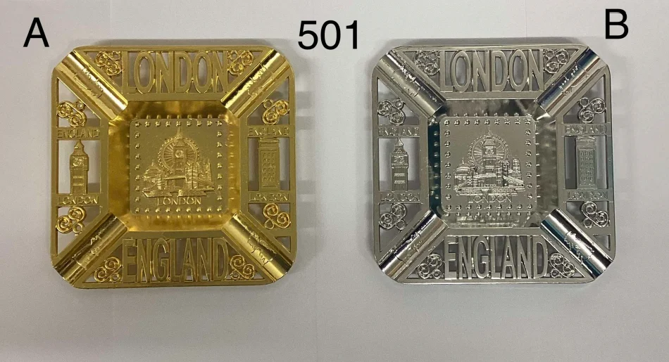 This London England Square Metal Ashtray features a solid square metal design with detailed embossed London landmarks and raised “London” and “England” lettering. With multiple cigarette rests and a polished metallic finish, it combines practical use with a bold London souvenir style, making it ideal for home use or gifting. Available in gold and silver finishes.
