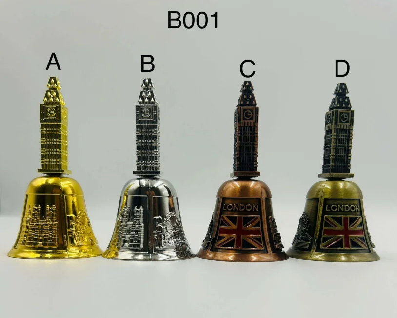 This Big Ben Bell Metal Souvenir features a detailed Big Ben tower mounted on a classic bell-shaped base, finished with embossed London landmarks and Union Jack detailing on selected styles. Crafted from solid metal with a polished finish, it produces a clear ringing sound and makes a distinctive London souvenir for display or gifting. Available in assorted metallic finishes.