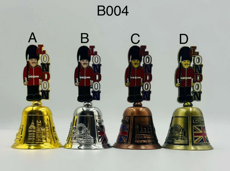 This London Guard Bell Metal Souvenir features a traditional British guard figure standing above bold “London” lettering, mounted on a classic bell-shaped metal base. Finished with embossed London landmarks and Union Jack detailing on selected styles, it produces a clear ringing sound and makes a charming London souvenir for display or gifting. Available in assorted metallic finishes.
