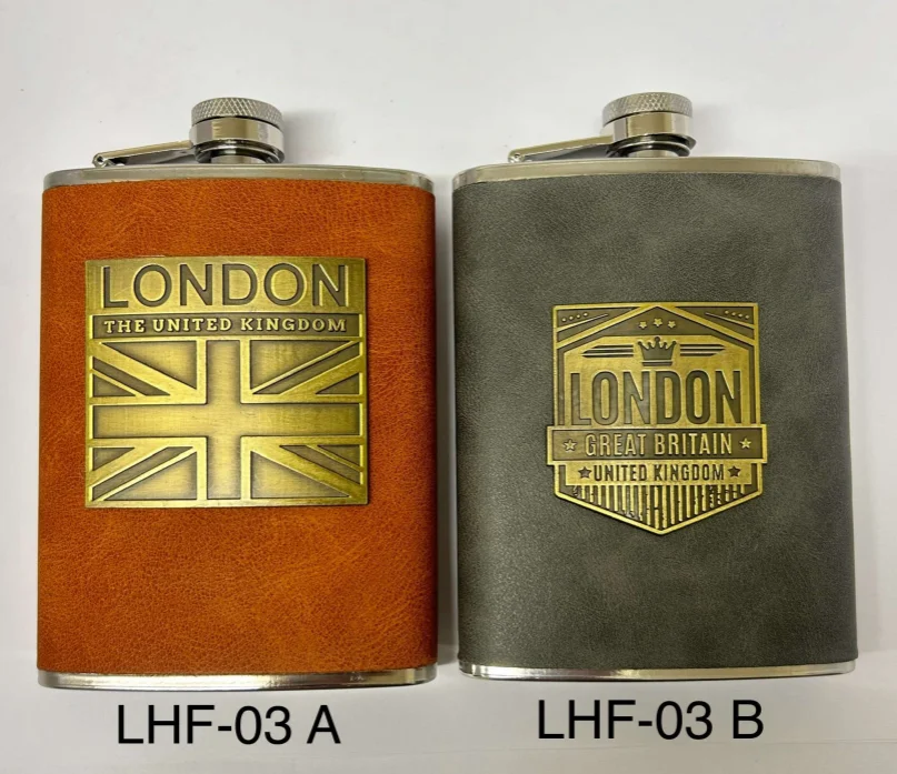 This London Leather Hip Flask features a stainless steel flask wrapped in a premium leather-style cover, finished with embossed London and United Kingdom designs. Compact and stylish, it is ideal for carrying spirits discreetly and makes a classic London souvenir or gift. Available in two design styles and colour finishes.