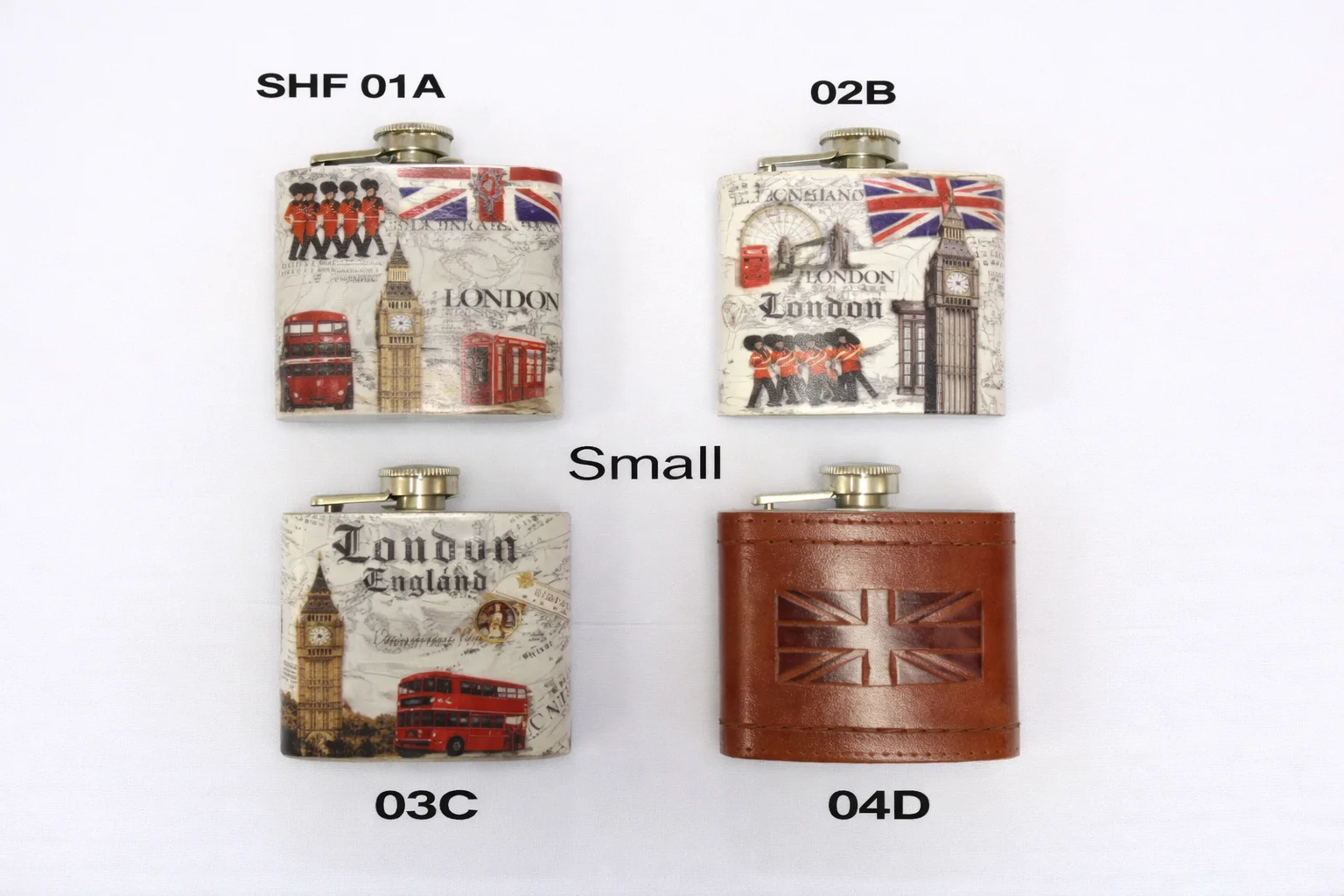 This Small London Souvenir Hip Flask is a compact and stylish keepsake, featuring classic London-themed designs. Each flask is finished with a secure screw cap and wrapped in decorative artwork or leather-style casing, showcasing iconic London landmarks such as Big Ben, red buses, Royal Guards, and the Union Jack.