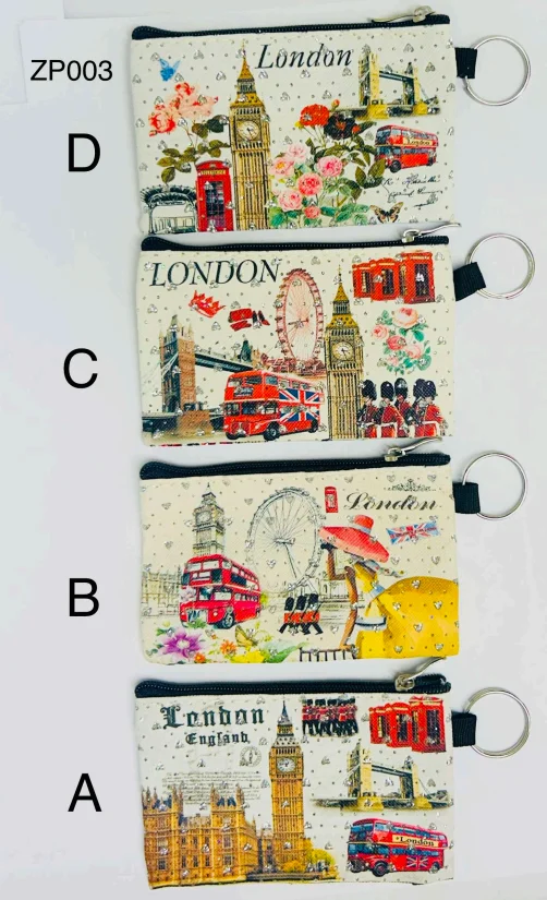 This compact London mini zip purse features colourful vintage-style illustrations of iconic London landmarks, including Big Ben, Tower Bridge, the London Eye, red buses, telephone boxes, and floral accents. Designed with a secure zip closure and attached metal keyring, it is perfect for carrying coins, keys, or small essentials. Ideal as a souvenir, gift item, or everyday accessory. Available in assorted designs A–D.
