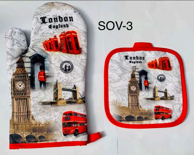 The London Oven Mitt & Pot Holder Set (SOV-3) showcases a classic vintage-style London design featuring Big Ben, Tower Bridge, red telephone boxes, royal guards, and red double-decker buses set against an antique map background. Finished with a bold red trim, this set combines practical kitchen protection with timeless London charm. Perfect for daily cooking use or as a distinctive London souvenir gift.