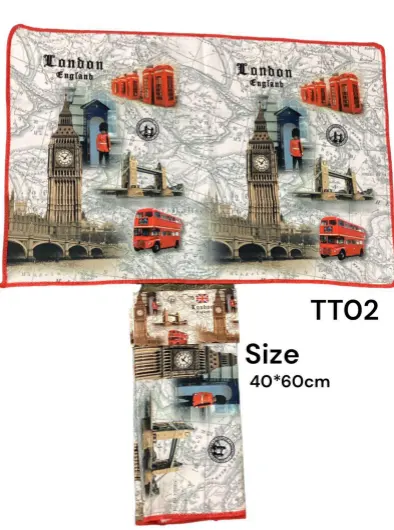 This London England Landmark Tea Towel features a detailed collage of iconic London scenes, including Big Ben, red telephone boxes, traditional guards, and double-decker buses, set against a map-style background. Made from soft, absorbent fabric with a red trim, it is both practical for everyday kitchen use and ideal as a classic London souvenir or gift.