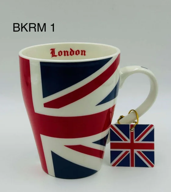 This London Union Jack Mug with Keyring features a bold Union Jack wraparound design with “London” printed inside the rim. Supplied with a matching Union Jack metal keyring attached to the handle, it combines a practical everyday mug with a classic London souvenir keepsake, ideal for gifting or souvenir collections.