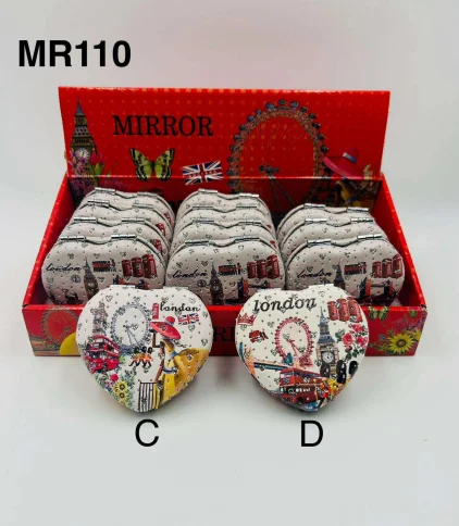 This London Souvenir Heart Compact Mirror features a charming heart-shaped design decorated with colourful London-themed illustrations, including Big Ben, the London Eye, red telephone boxes, double-decker buses, and classic city motifs. Compact and lightweight with a hinged opening, it is perfect for everyday use, handbags, or as a thoughtful London gift souvenir. Available in assorted design styles.