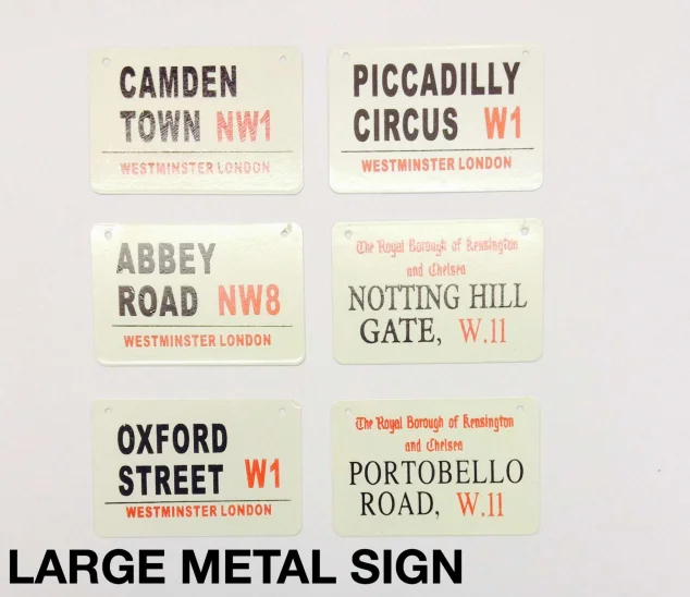 This London Street Name Metal Wall Sign features a vintage-style UK street sign design inspired by famous London locations such as Camden Town, Piccadilly Circus, Abbey Road, Oxford Street, Notting Hill Gate, and Portobello Road. Finished with classic typography and postcode details, it is ideal for wall display, home décor, cafés, shops, or as a distinctive London souvenir gift. Available in assorted street name designs.