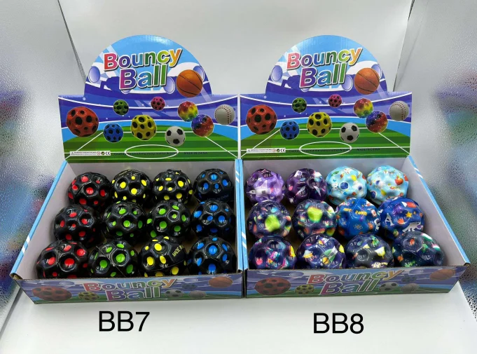 These Printed Bouncy Balls feature colourful and fun designs, including fruit patterns and galaxy-style prints. Made from durable rubber, they provide high bounce performance and are perfect for children’s play, party bags, gift shops, or souvenir stores. Supplied in a countertop display box, ideal for retail presentation.