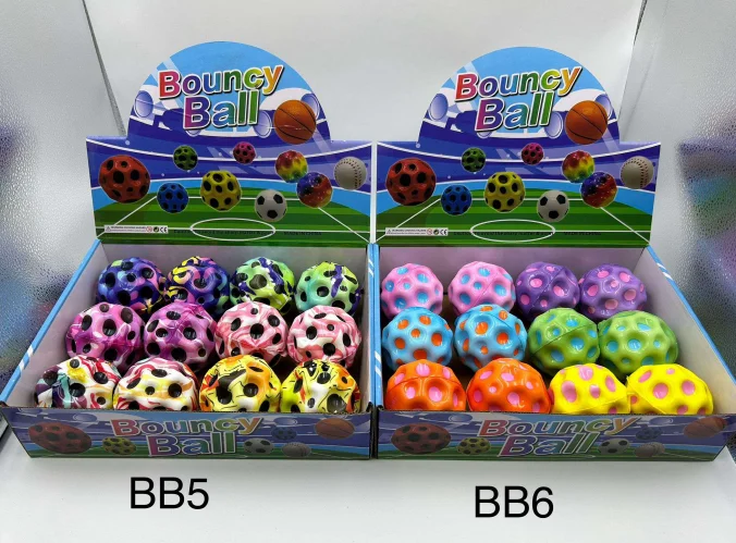 These Printed Bouncy Balls feature colourful and fun designs, including fruit patterns and galaxy-style prints. Made from durable rubber, they provide high bounce performance and are perfect for children’s play, party bags, gift shops, or souvenir stores. Supplied in a countertop display box, ideal for retail presentation.