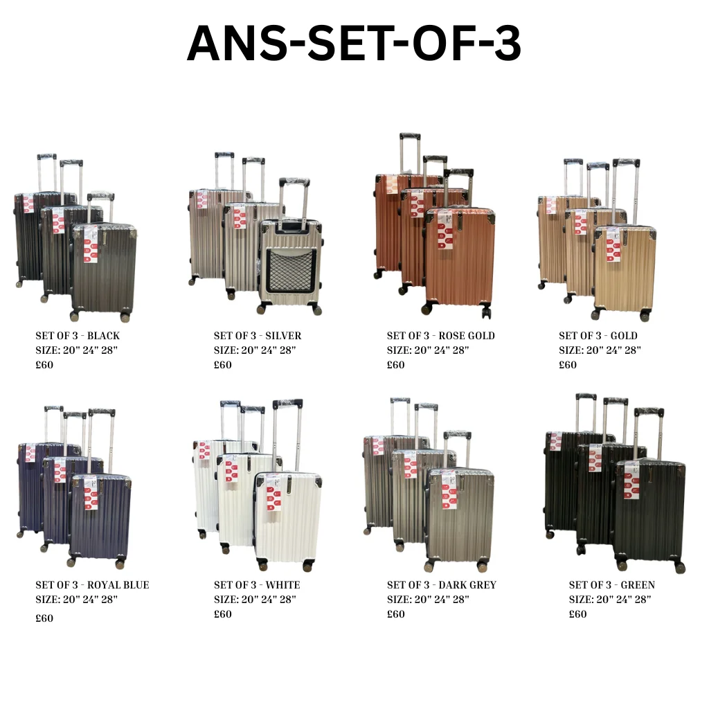 The ANS Set of 3 Luggage is a durable and stylish travel solution designed for short trips to long journeys. Each set includes three different suitcase sizes that nest inside each other for easy storage, offering practicality, strength, and modern design.
