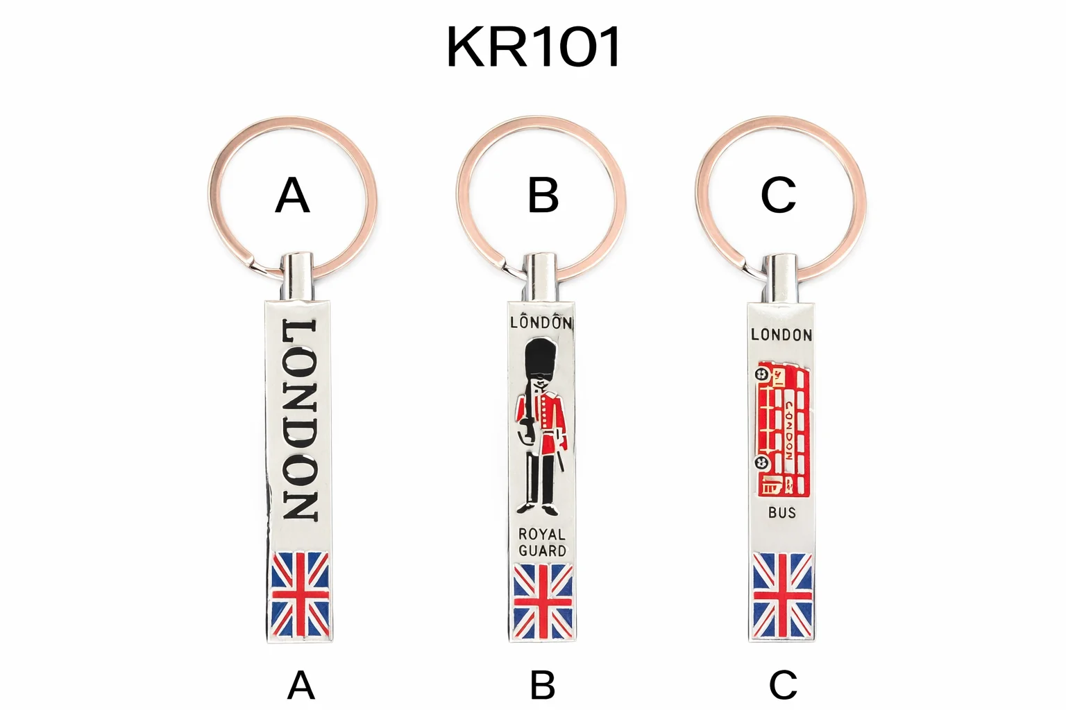 This classic London Rectangular Metal Keyring features a sleek rectangular metal design decorated with iconic London themes including “London” text, Royal Guard, and red double-decker bus designs, finished with a Union Jack detail. Crafted from durable metal with smooth polished edges, it makes a stylish and practical souvenir.