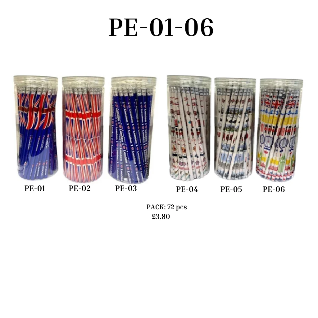 This pack includes 72 pens in various London-themed designs, perfect for souvenirs or retail displays. Each pen features iconic London imagery, such as the Union Jack, Big Ben, and London buses. The pens come in six different designs, each with a vibrant and colorful look.
