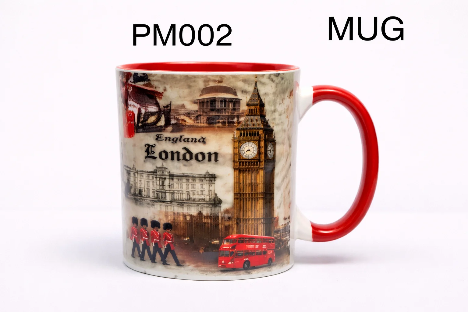 This England London Heritage Collage Ceramic Mug features a classic vintage-style montage of iconic London imagery, including Big Ben, historic architecture, the Royal Guards, and the famous red double-decker bus. Finished with a red handle and matching inner rim, it offers a traditional and elegant London souvenir look. Made from durable ceramic, it is ideal for everyday tea or coffee, gifting, or souvenir retail collections.