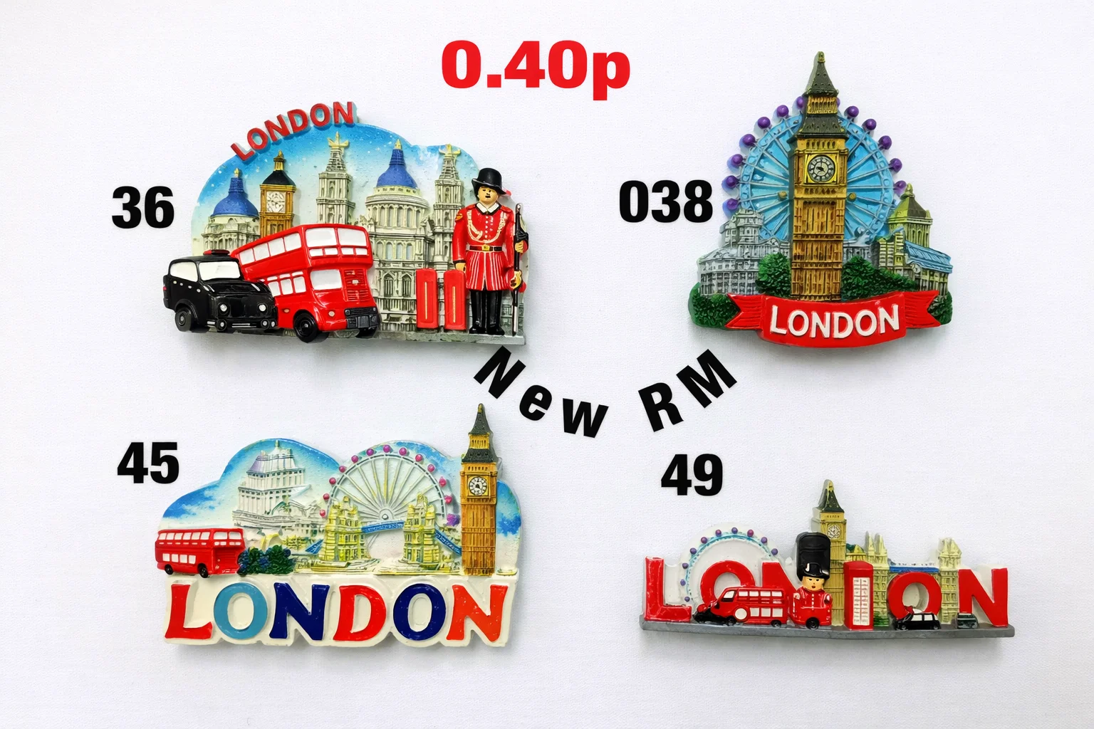 Assorted new-design London resin fridge magnets supplied as a mixed, non-selectable selection. This range features vibrant London landmark scenes including Big Ben, the London Eye, red double-decker buses, black taxis, Royal Guards, and bold “LONDON” lettering. Each magnet is finished with colourful hand-painted details and raised 3D relief, perfect for souvenir and gift retail.