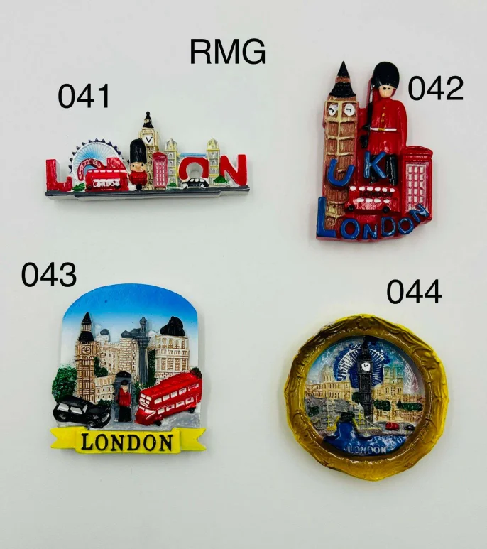This London Highlights Resin Magnet Collection showcases a mix of classic and decorative London scenes, featuring iconic landmarks such as Big Ben, the London Eye, red telephone boxes, Royal Guards, black taxis, and red double-decker buses. Each piece is crafted from durable resin with raised detailing and vibrant hand-painted colours, making them standout London souvenir magnets.