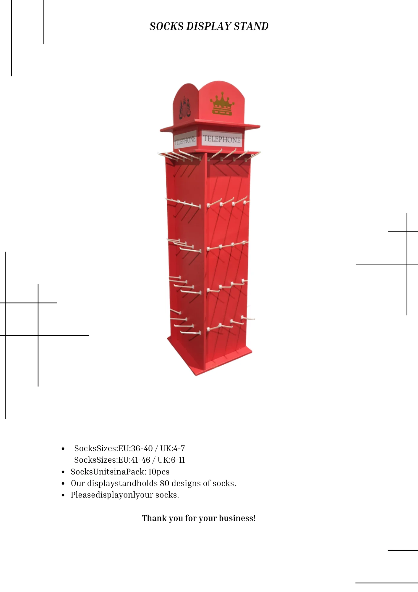 This London Telephone Box Socks Display Stand is a bold and eye-catching retail fixture designed in the style of the iconic red British telephone box. Ideal for souvenir shops and gift stores, it provides an attractive and organised way to showcase London-themed socks while maximising floor space and visual impact.