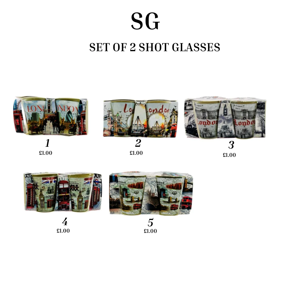 These London-themed shot glasses are sold in sets of two, each featuring iconic London landmarks. Each set is priced at £1.00, perfect as souvenirs or for collectors.